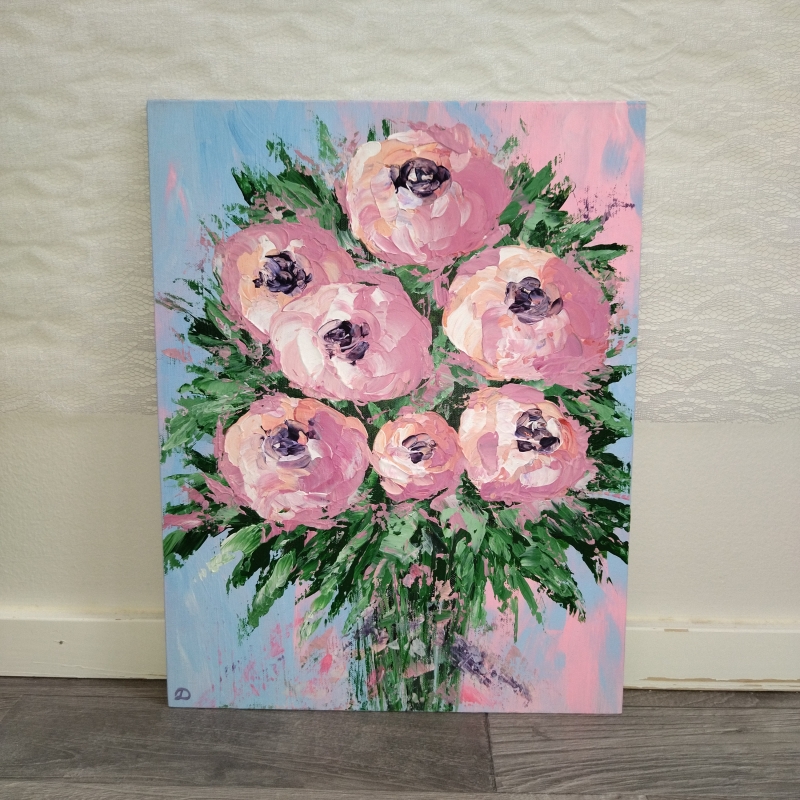 Kuvaus: Akryyli palettiveitsellä, Kangaspahvipohja, reunat maalattuja, tekstuuri, suojalakka