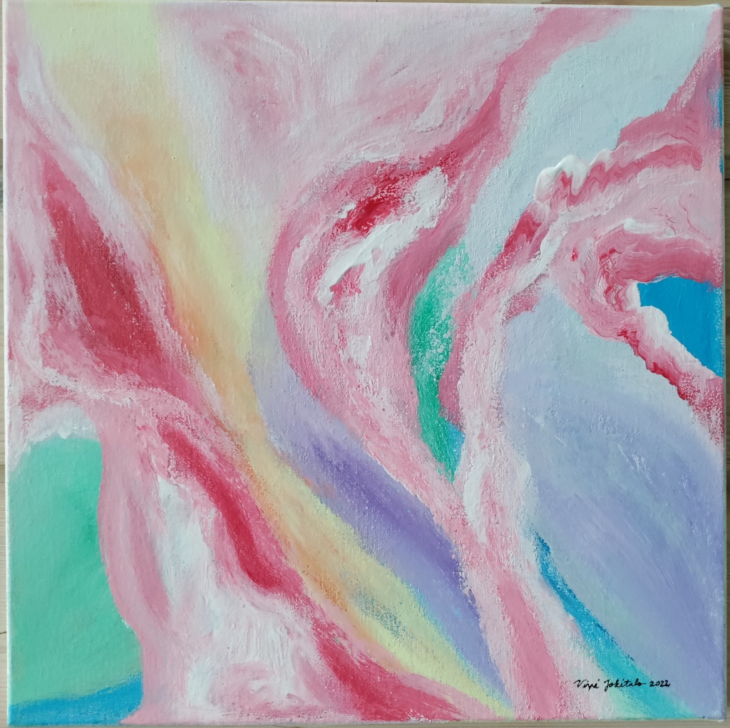 Kuvaus: Värikäs abstrakti näkymä.Ripustusvalmis.Signeeraus edessä.