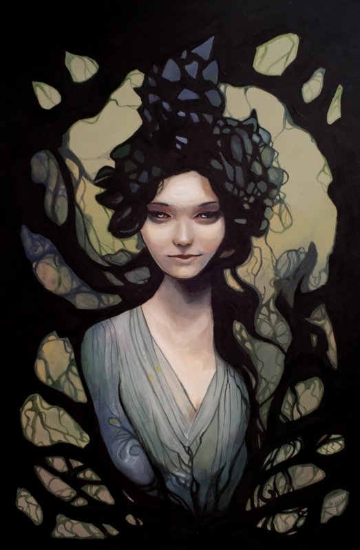 Kuvaus: Metsänhenki aiheinen akryylimaalaus kovalevylle