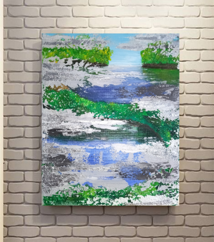 Kuvaus: Hopeanhohtoinen ja kohopintainen akryylimaalaus kankaalla. Teos on kiilapuissa, joten se ei tarvitse erillistä kehystä. Ripustusvalmis.