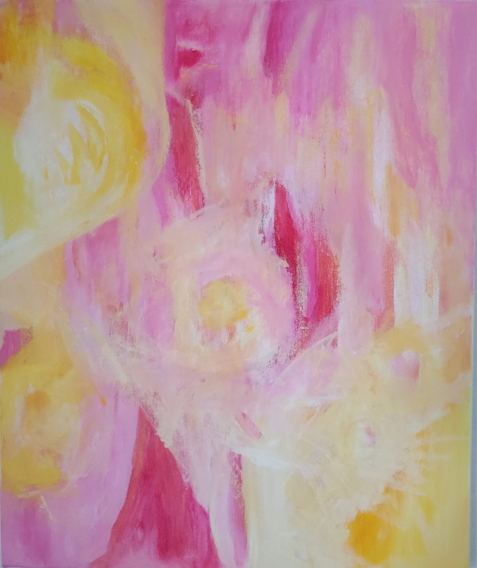 Kuvaus: Värikäs abstrakti näkymä.Ripustusvalmis.Teos on monesta suunnasta katsottava.Signeeraus takana.
