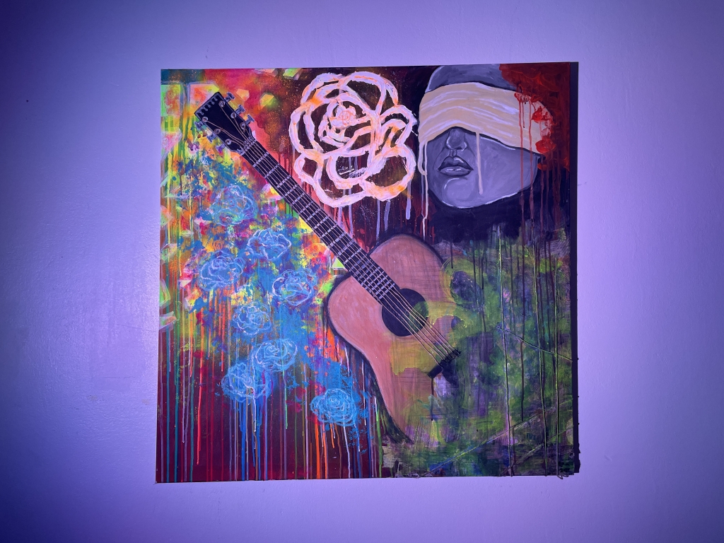 Kuvaus: Spay,- akrylli- ja uv-maali. Kitaran kielessä hartsilankaa.