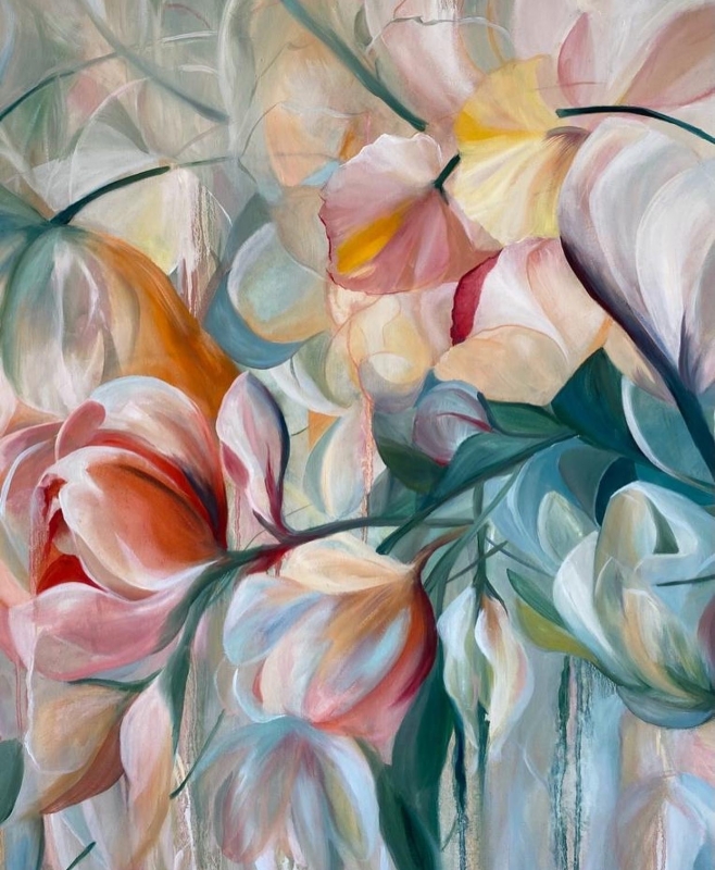 Kuvaus: Abstrakti kukkamaalaus, canvaspohjaan, ilman kehyksiä ripustusvalmiina