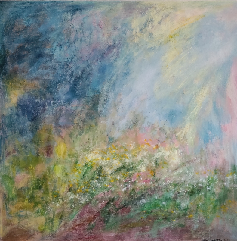 Kuvaus: Värikäs abstrakti näkymä.Ripustusvalmis.Signeeraus edessä.