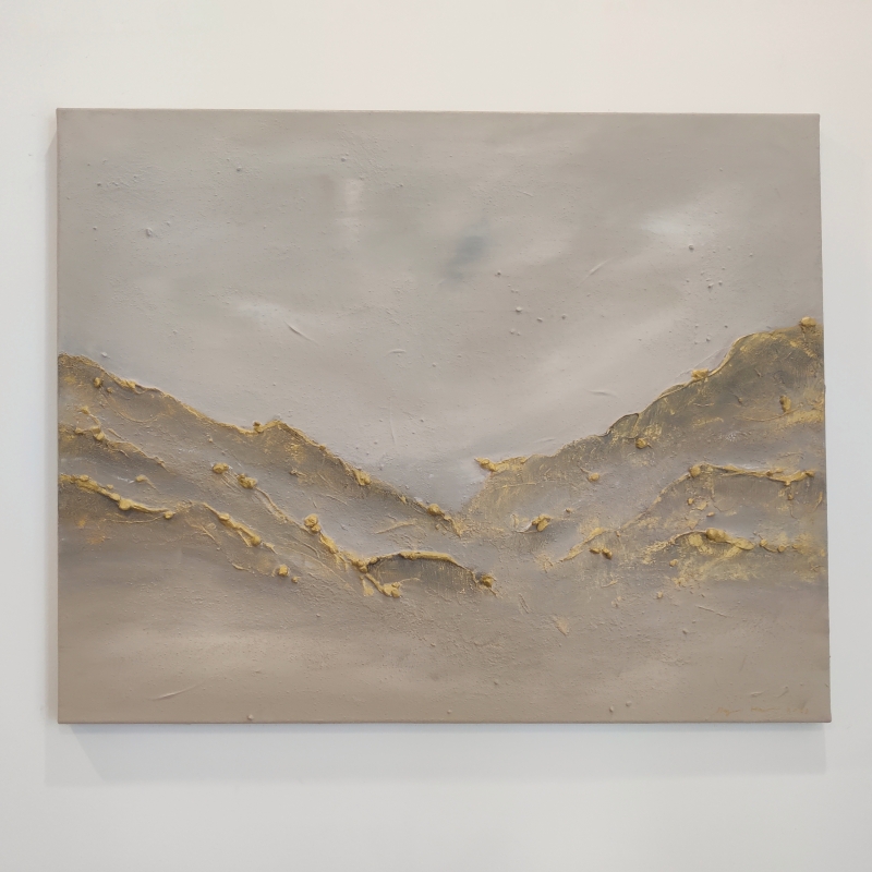 Kuvaus: Kohopintainen abstrakti maalaus. Pinnassa ihanaa kullan hohtoa