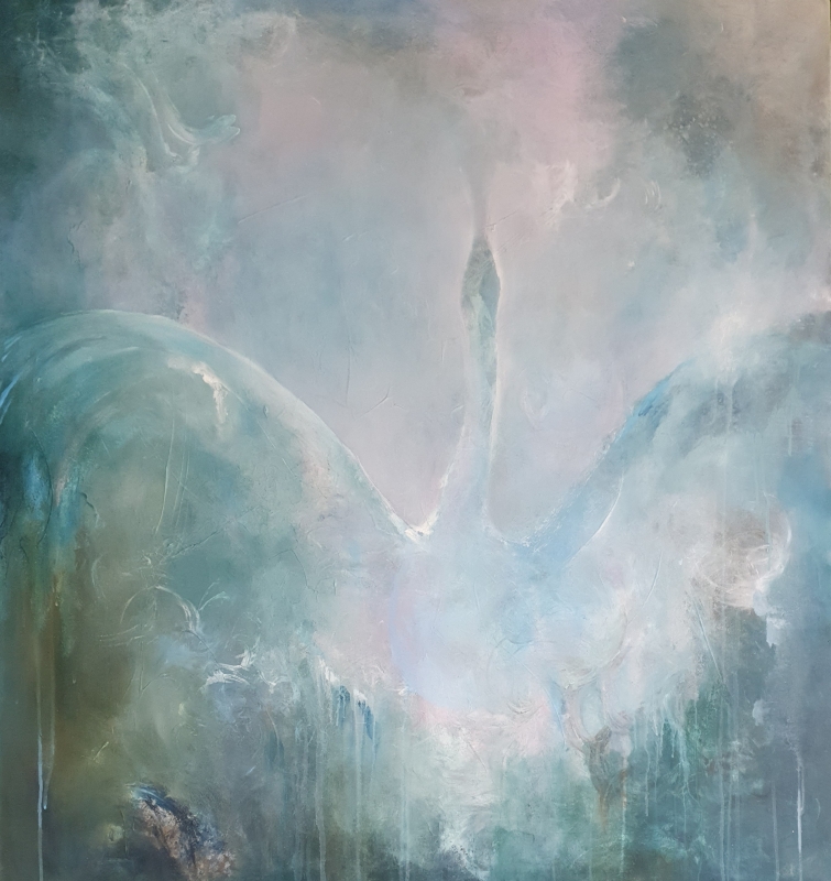 Kuvaus: Abstrakti akryylimaalaus, sekatekniikka, joutsen