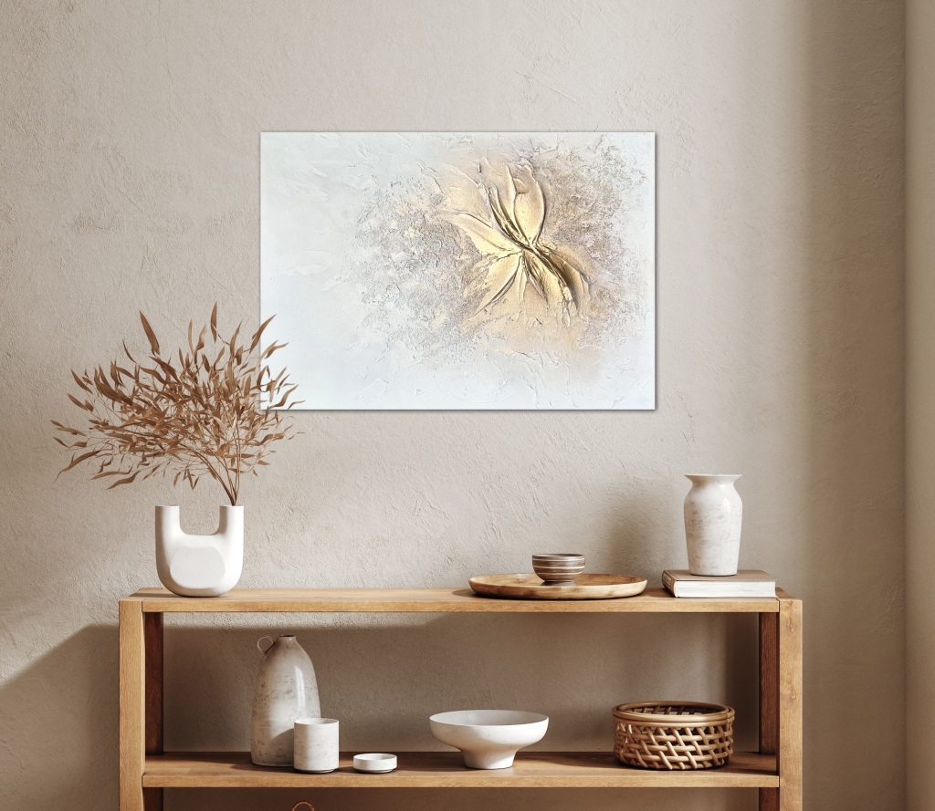 Kuvaus: Valkoinen, hieman ruskeaa ja kullanhohtoinen. Sisältää myös tekstuuria. Voi ripustaa vaaka- tai pystysuunnassa
