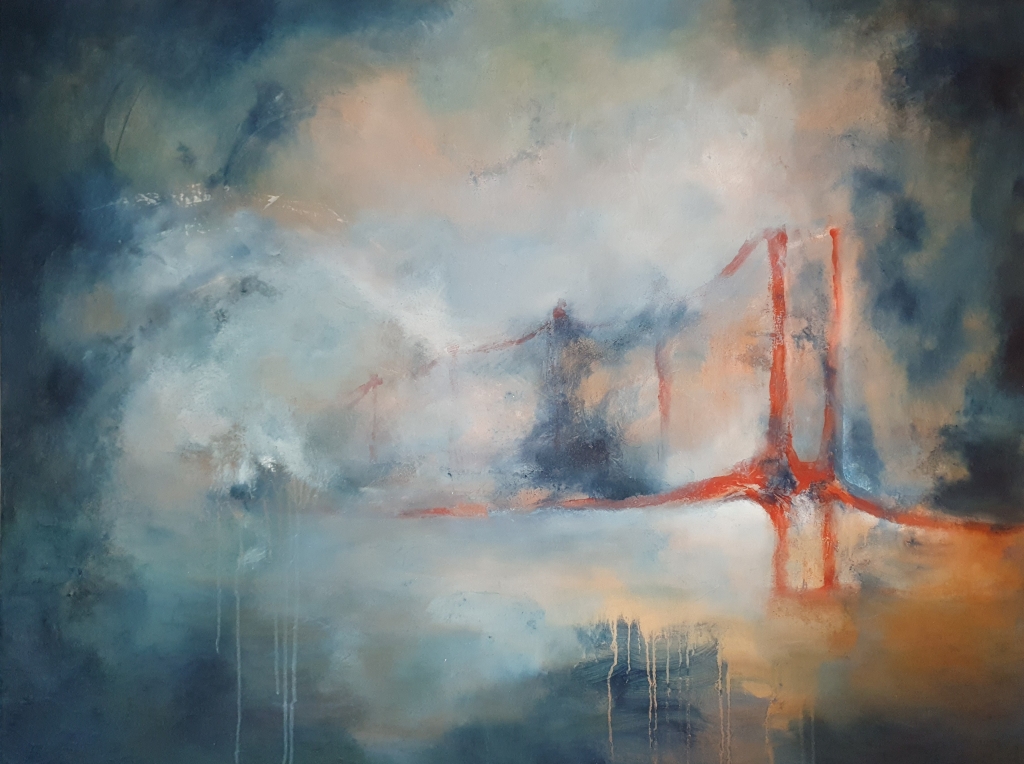 Kuvaus: Abstrakti akryylimaalaus, maisema, silta