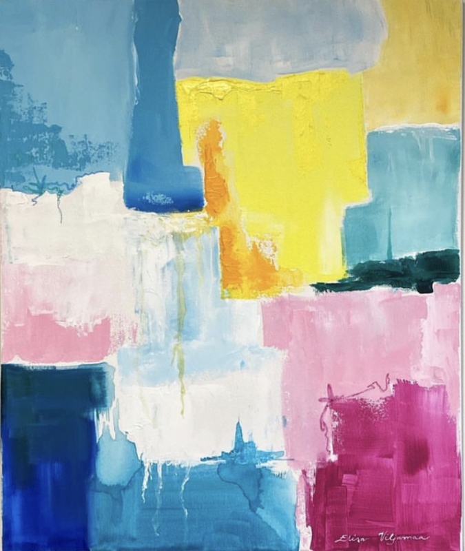 Kuvaus: Abstrakti valoa ja iloa tuova teos. Ripustusvalmis. Värit sopivat hyvin monenlaiseen sisustukseen ja tilaan. Väriä elämään.