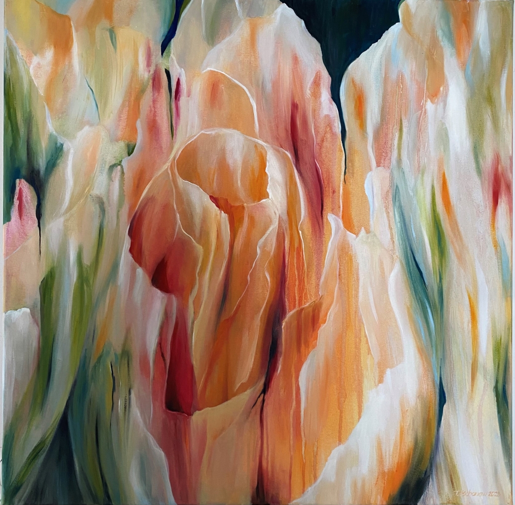 Kuvaus: Abstrakti kukkamaalaus, canvaspohjaan, ilman kehyksiä ripustusvalmiina