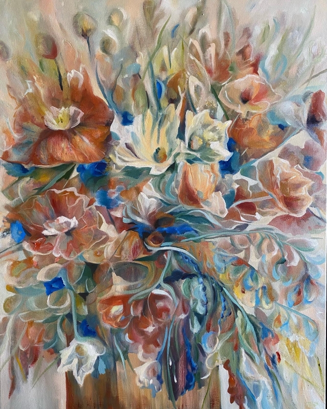 Kuvaus: Abstrakti kukkamaalaus, värikäs, sisustustaulu