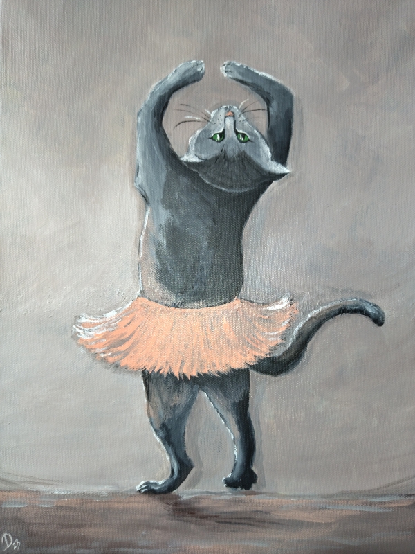 Kuvaus: Upea akryylimaalaus kankaalla, joka kertoo kissojen luonnollisesta notkeudesta ja elegantista. Teos on kiilapuissa, joten se ei tarvitse erillistä kehystystä.