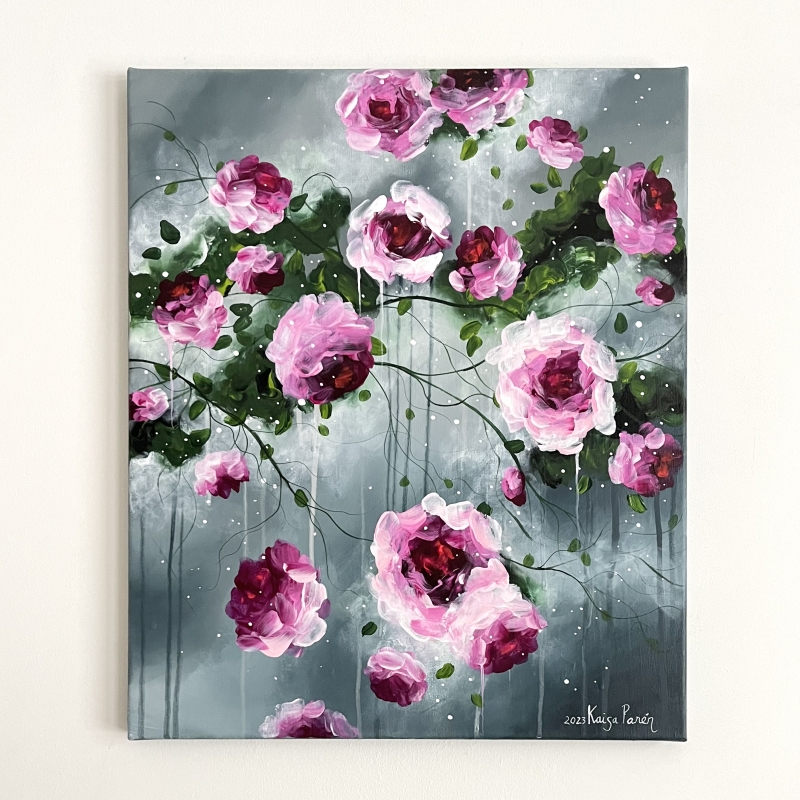 Kuvaus: Näyttävä kukkamaalaus. Ripustusvalmis.