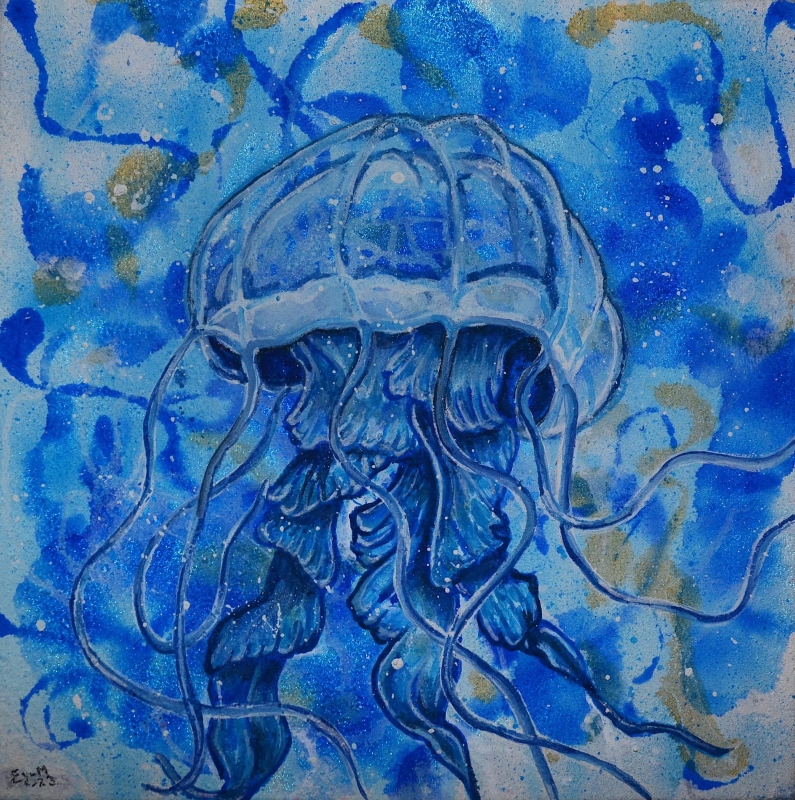 Kuvaus: Akryllimaalaus, jossa on myös musteväriä. Hohtaa uv-valolla