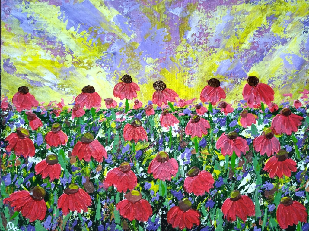 Kuvaus: Kohopintainen akryylimaalaus kangaspahvipohjalla