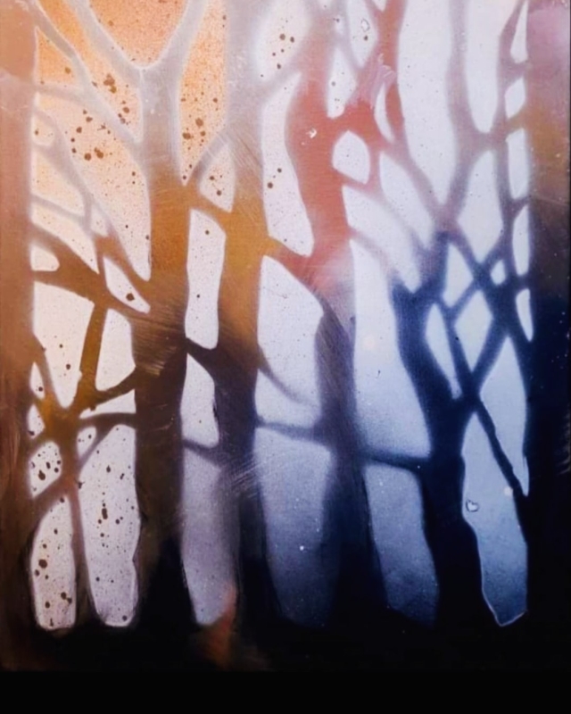Kuvaus: Akryyleilla tehty sekatekniikalla canvaspohjalle. Ripustusvalmis. Takana on metallilanka.