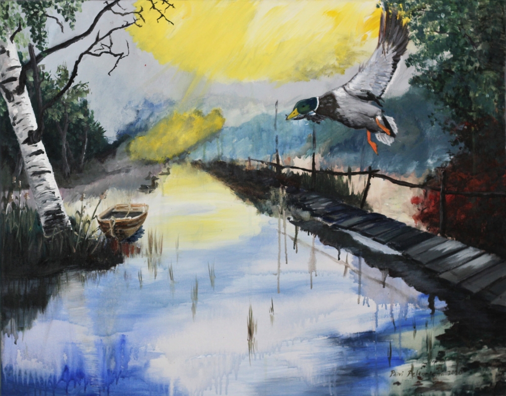 Kuvaus: Satumainen ja näyttävä iso akryyliväriteos sisustustauluksi