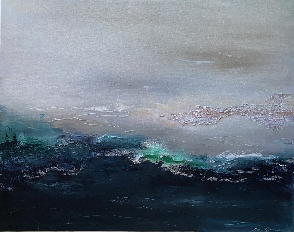 Kuvaus: Abstrakti teos, puhuttelevissa sävyissä. Vaakasuuntainen, ripustusvalmis. Sopii monenlaiseen sisustukseen ja tilaan.