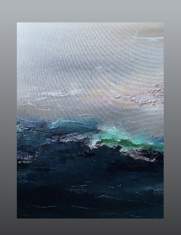 Kuvaus: Abstrakti teos, tummat syvät sävyt. Yksityiskohta teoksesta syysmyrsky. Vahva, kaunis teos.