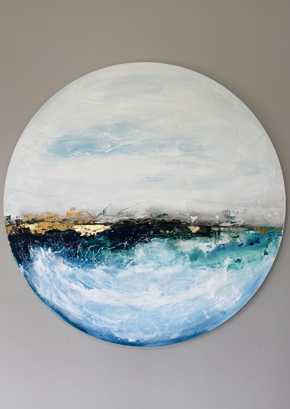 Kuvaus: Pyöreälle pohjalle maalattu akryyliteos. Ripustusvalmis, raikkaat sävyt. Ripaus lyöntimetallia antamaan kullanhohtoa.