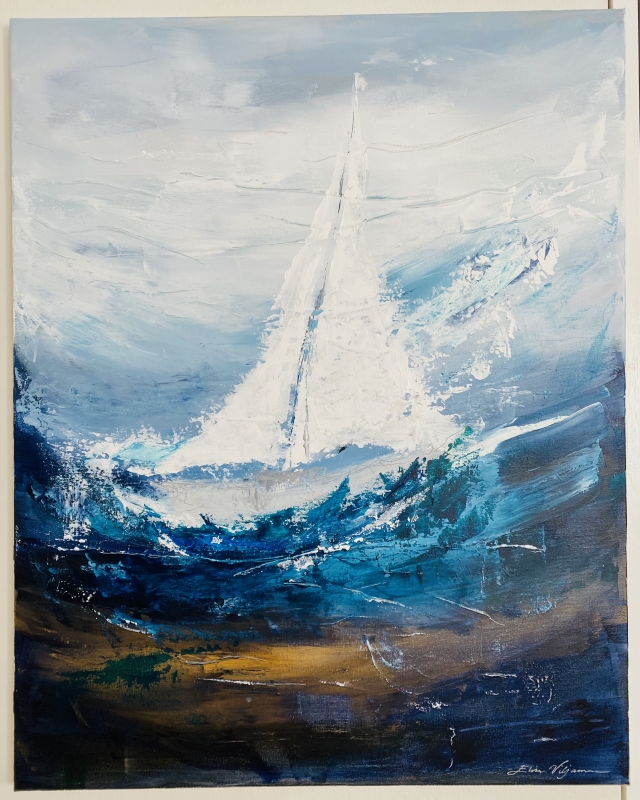 Kuvaus: Tunteikas, syvällinen, meren ja luonnon sävyt. Ripustusvalmus