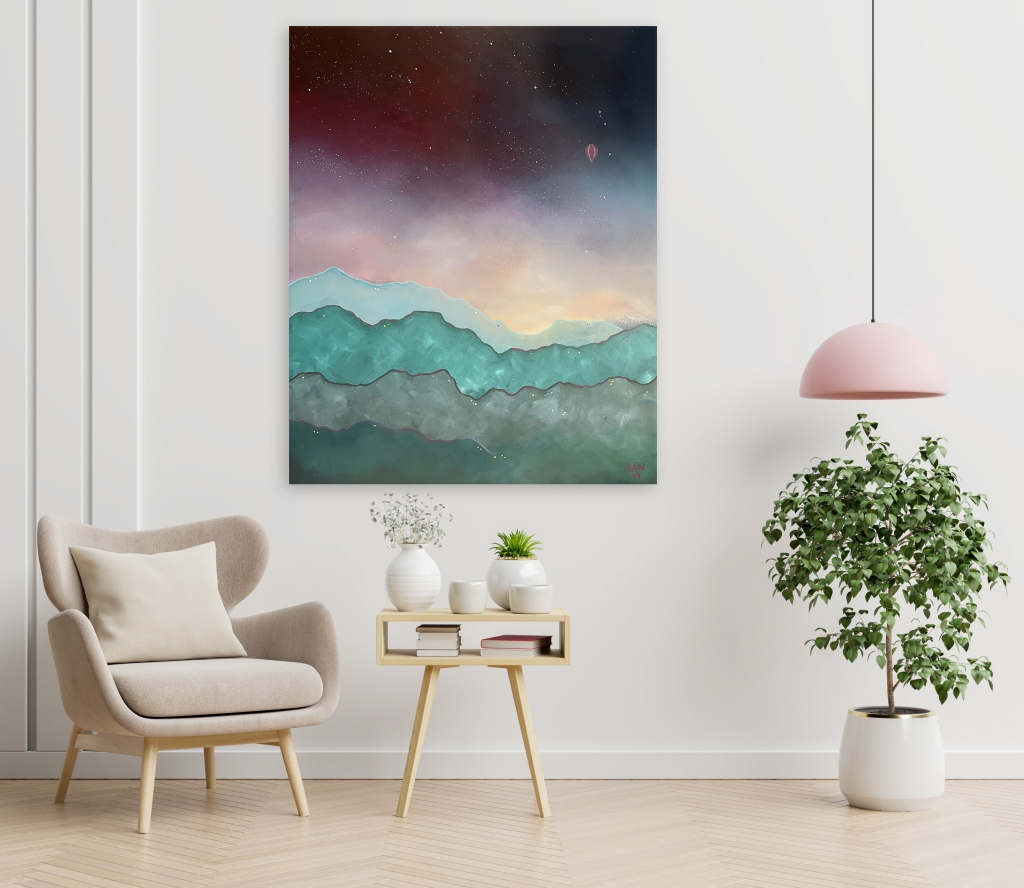 Kuvaus: Suurikokoinen ja värikäs maalaus auringonlaskusta vuoriston yllä. Taivaalla leijailee kuumailmapallo matkalla jonnekin. Tämä suurikokoinen ja näyttävä maalaus sopii moneen tilaan! Lisäkuvia pyynnöstä.