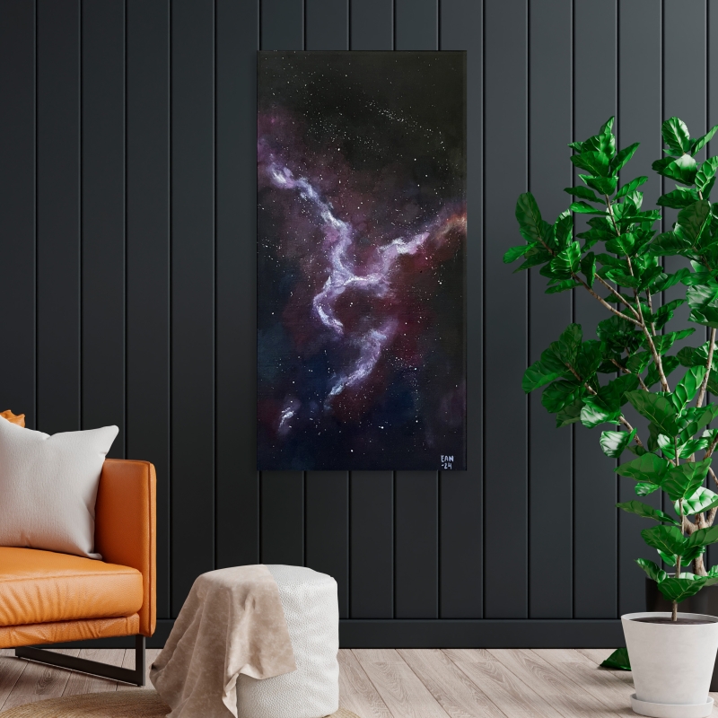 Kuvaus: Abstrakti galaksimaalaus. Tämä kapea, värikäs maalaus sopii moneen tilaan! Teoksen reunat on maalattu, joten voit ripustaa tämän seinällesi ilman erillistä kehystämistä. Maalauksella on myös pari, Skathi ja teokset voi ostaa yhdessä erikoishintaan 299€.