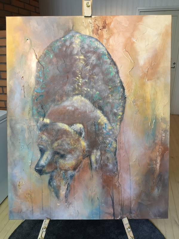 Kuvaus: Metsän kuningas karhu. Akryyli canvasille, myös reunat maalattu, joten ei tarvitse välttämättä kehyksiä, valmis ripustettavaksi seinälle.