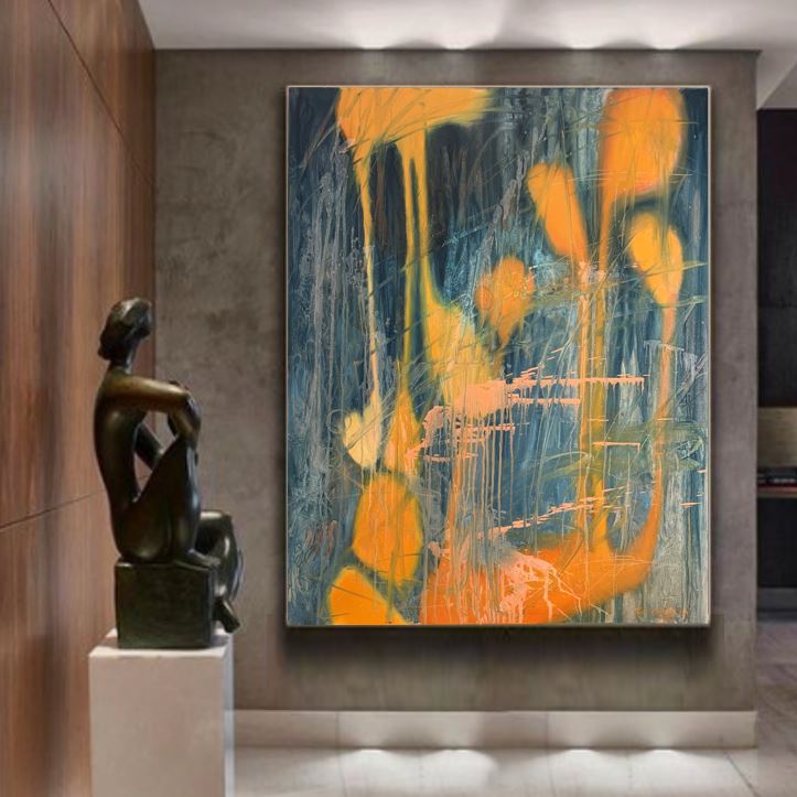 Kuvaus: Abstrakti teos. Sinertävä ja oranssi maalaus. Pirteä kuin Jaffa ja vähän luovaa tuhoa. Reunat maalattu. Ripustusvalmis. Uniikki öljyväriteos.