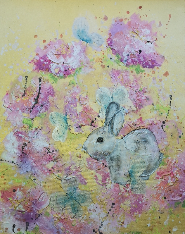 Kuvaus: Pikku pupu, kukkia ja perhosia. Kaunis ja herkkä teos. Canvas, valmis ripustettavaksi seinälle.