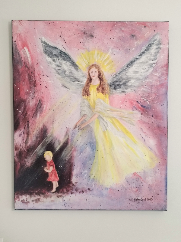 Kuvaus: Isokokokoinen ja näyttävä suojelusenkelitaulu tytölle vaikka lastenhuoneeseen.