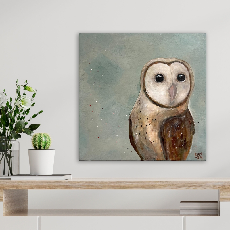Kuvaus: Ihmettelevä tornipöllö etsii uutta kotia! Tämän teoksen reunat on maalattu, joten voit ripustaa sen seinällesi myös ilman erillistä kehystämistä.