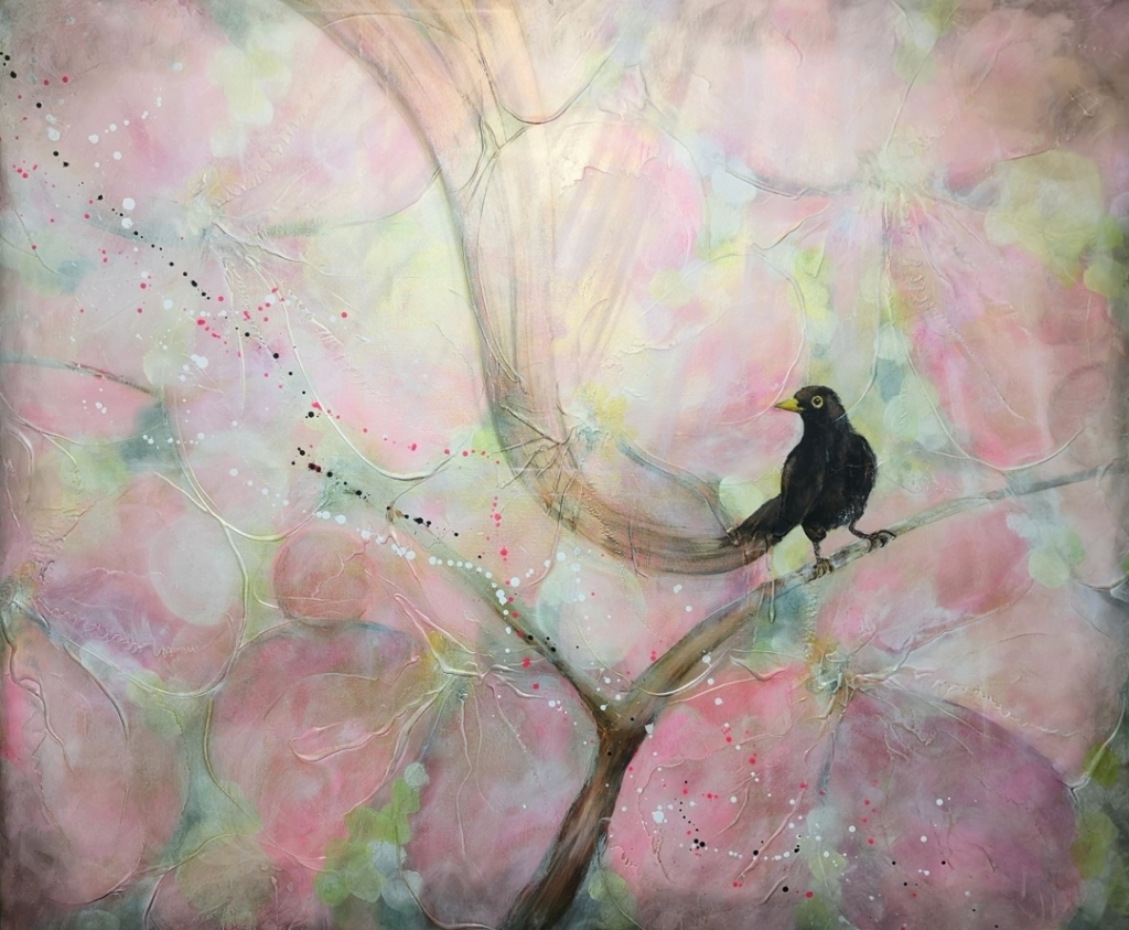 Kuvaus: Mustarastas, kaunis ja herkkä teos. Suurikokoinen teos canvasille, jossa on paljon struktuuria ja myös reunat maalattu.