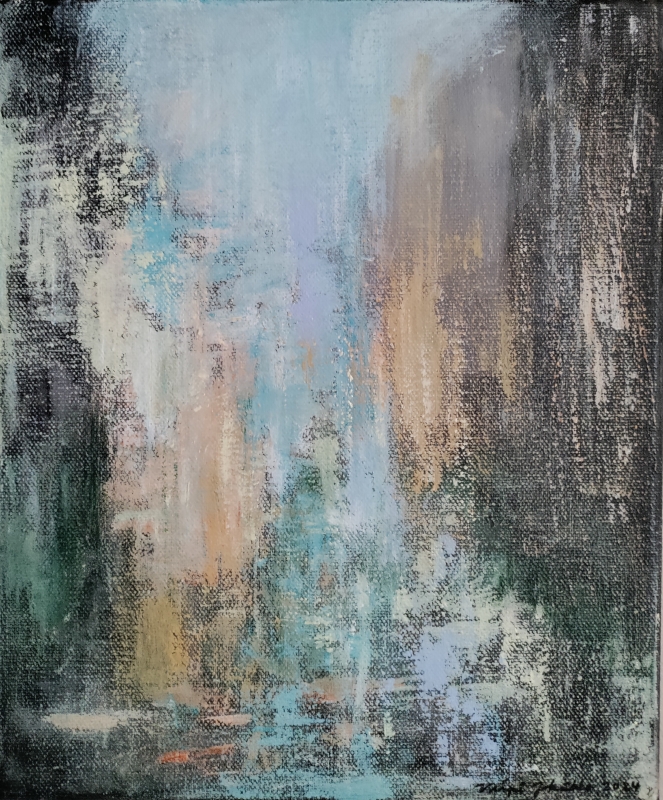 Kuvaus: Abstrakti näkymä. Signeeraus edessä ja takana. Ripustus valmis.