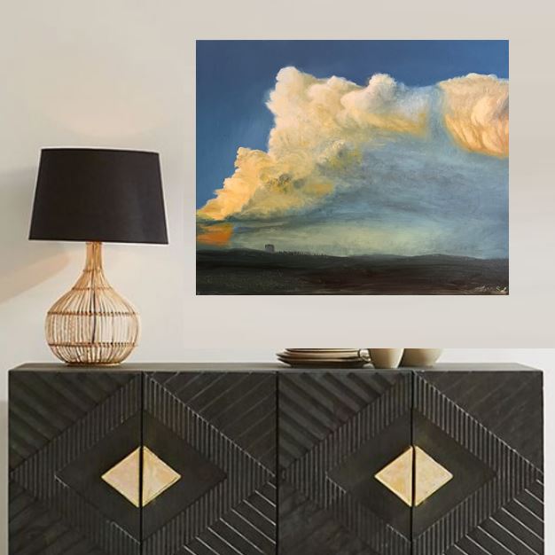 Kuvaus: Esittävä teos. Aiheena auringon värjäämät pilvet. Tarinaa maalaukseen luo torni, jonka ympärillä voi nähdä joukon ihmisiä - ehkä. Reunat maalattu. Ripustusvalmis. Uniikki.