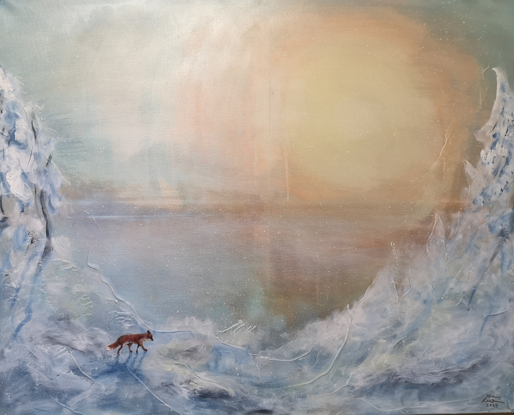 Kuvaus: Kettu talvella, kaunis ja herkkä teos. Suuri ja näyttävä, struktuuria ja myös reunat maalattu.
