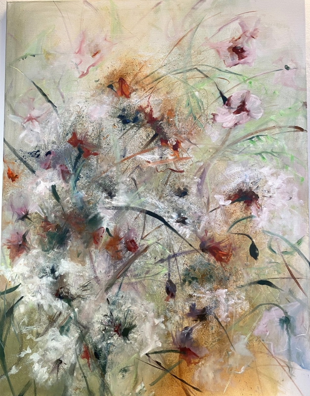 Kuvaus: Abstrakti kukkamaalaus, canvaspohjaan, ilman kehyksiä ripustusvalmiina