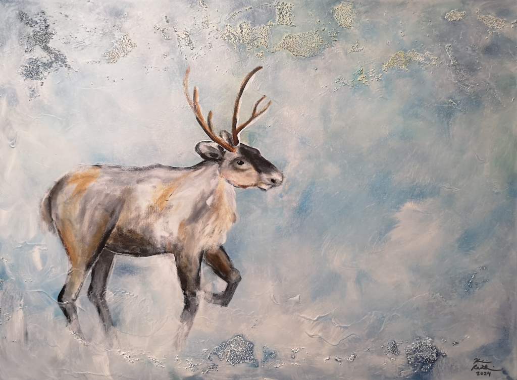 Kuvaus: Poro talvella, teoksessa struktuuria ja myös reunat maalattu.