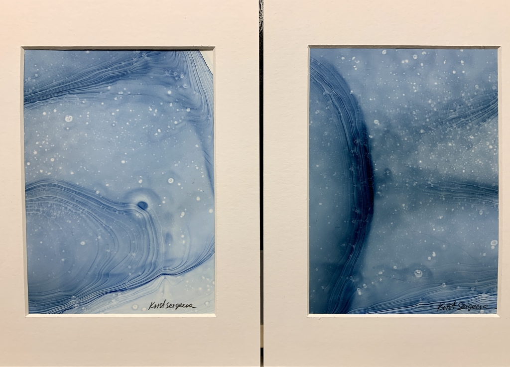 Kuvaus: ”Syvä uni” kaksiosainen sarja. Abstrakti alkoholimustemaalaus muovipaperille paspartuurin kanssa, 18cm x 24cm kokoiseen kehykseen paspatuurin kanssa. Koko-sarja tai 35 € kpl. Postitus tai nouto Turusta.