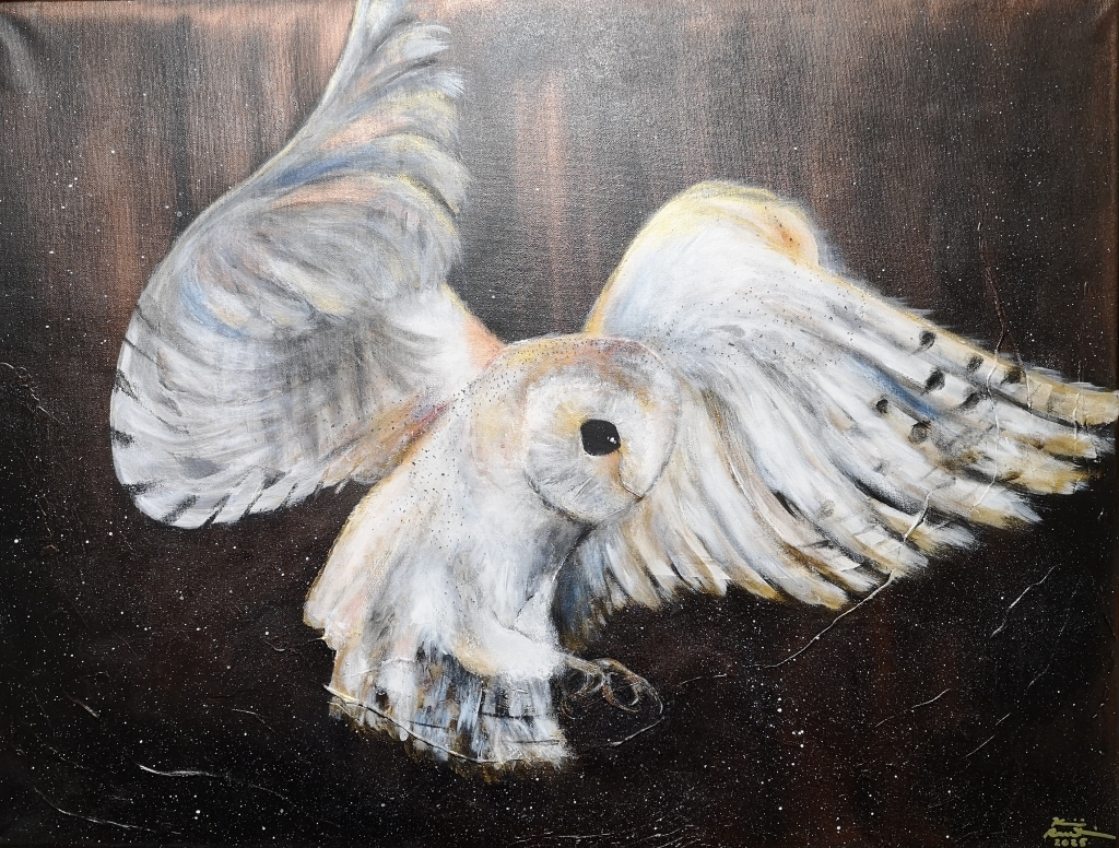 Kuvaus: Pöllön yölento, kaunis ja herkkä teos. Teoksessa on struktuuria ja myös reunat maalattu. Canvas on valmis ripustettavaksi seinälle.