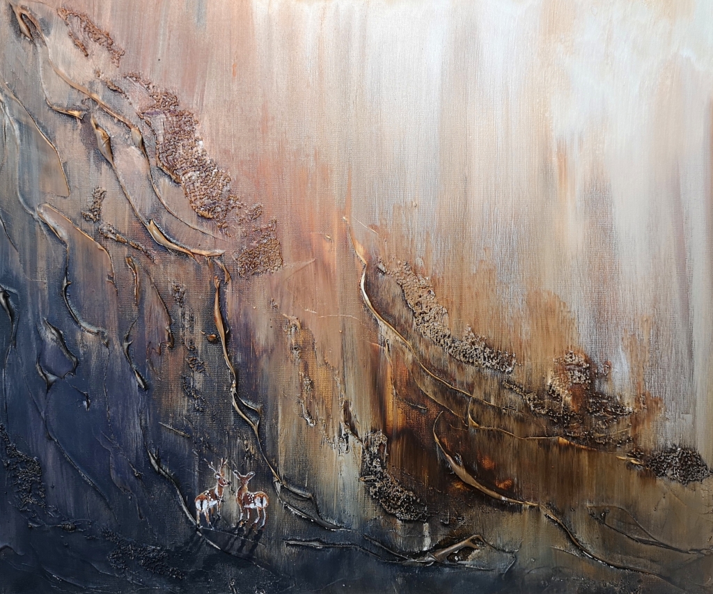 Kuvaus: Peurat, kaunis ja herkkä teos, jossa on paljon struktuuria ja myös reunat maalattu. Valmis ripustettavaksi seinälle.