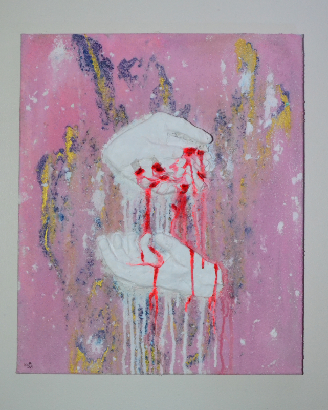 Kuvaus: Akryylimaalaus kankaalle, jossa on kipsikiveä, kuivasavea sekä lasin risuja. Kädet tehty valuraudasta ja kuivasta savesta.