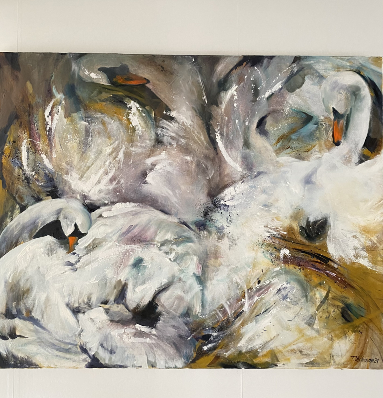 Kuvaus: Valmis ripustettavaksi, Joutsenet pellolla, sisustustaulu, öljyvärimaalaus