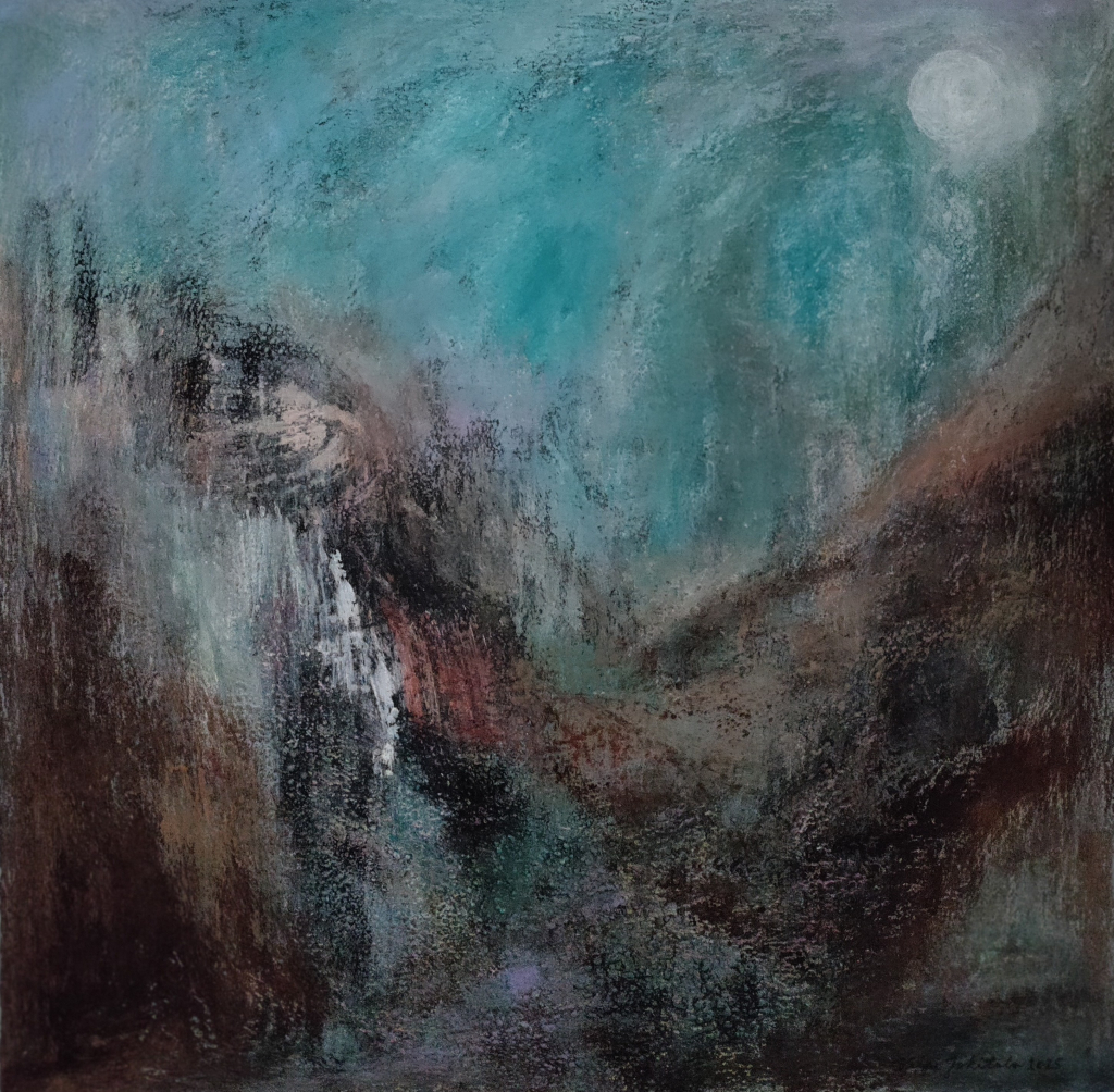 Kuvaus: Maisema maalaus, jossa kuutamo loistaa tunnelmallisesti. Signeeraus edessä ja takana. Ripustus valmis.