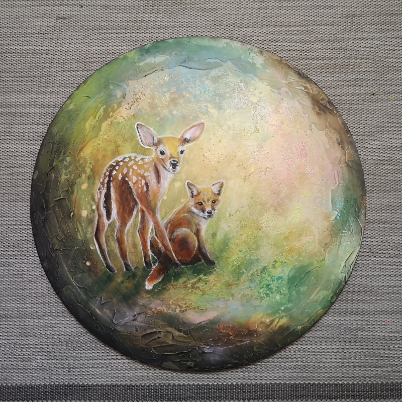 Kuvaus: Kettu ja peura, pienet ystävykset, kaunis ja herkkä teos. Pyöreä canvas, struktuuria, valmis ripustettavaksi seinälle.