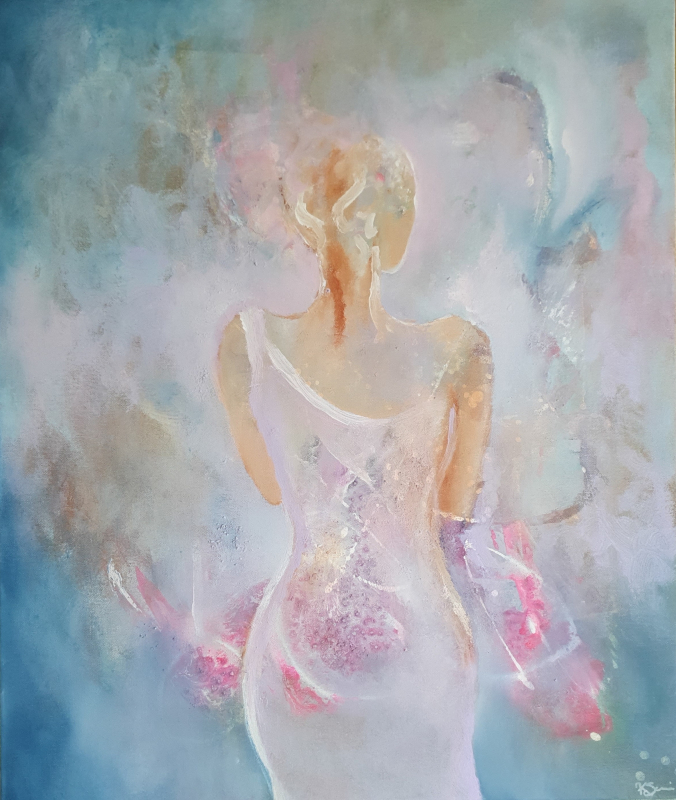 Kuvaus: Abstrakti akryylimaalaus, naisfiguuri, lämmin