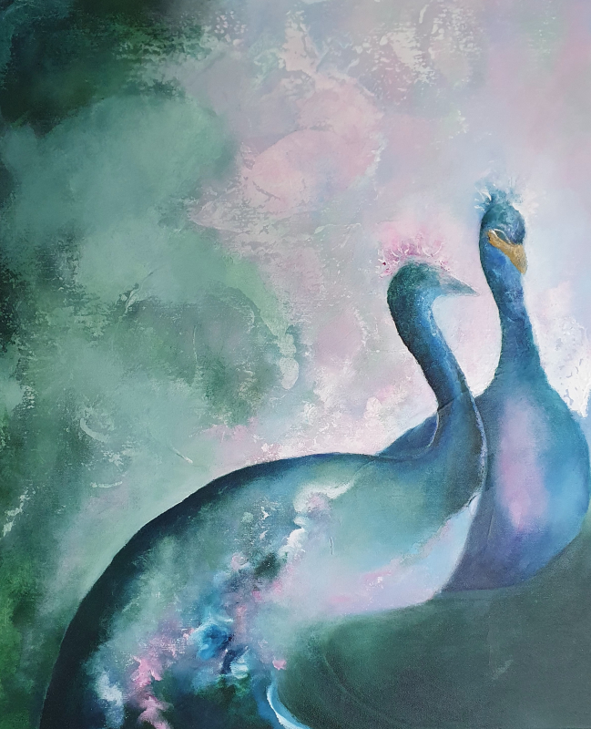 Kuvaus: Abstrakti akryylimaalaus, riikinkukkomaalaus