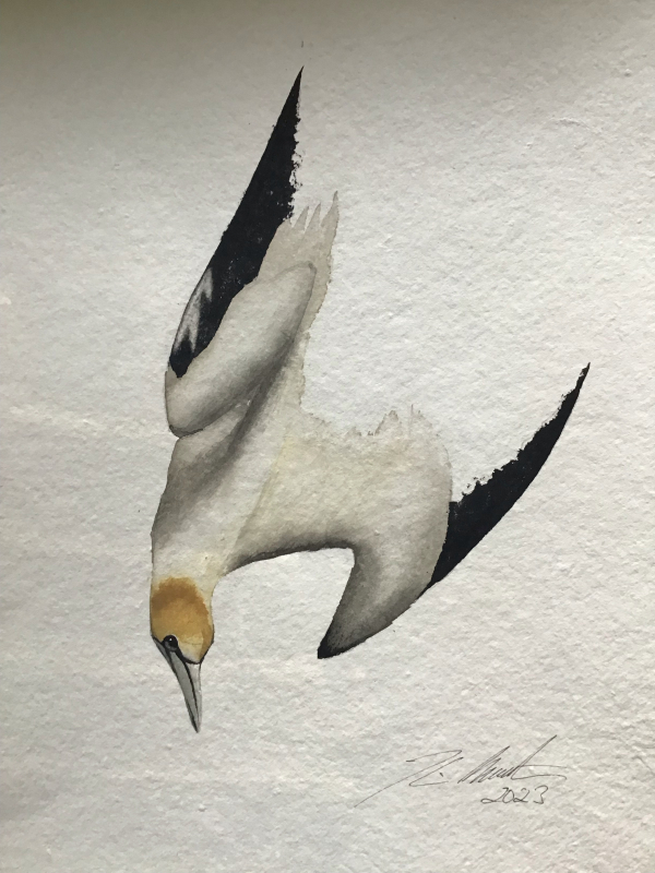 Kuvaus: Lintuaiheinen akvarelli, maalattu käsintehdylle paperille