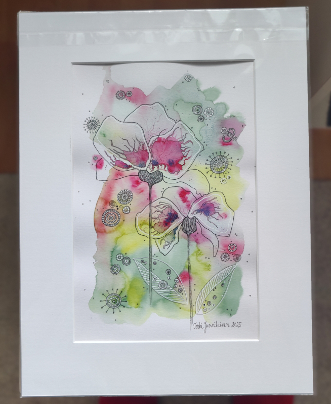 Kuvaus: Akvarelli, tussi, paspatuuri, kuvan mitat 21x30 cm