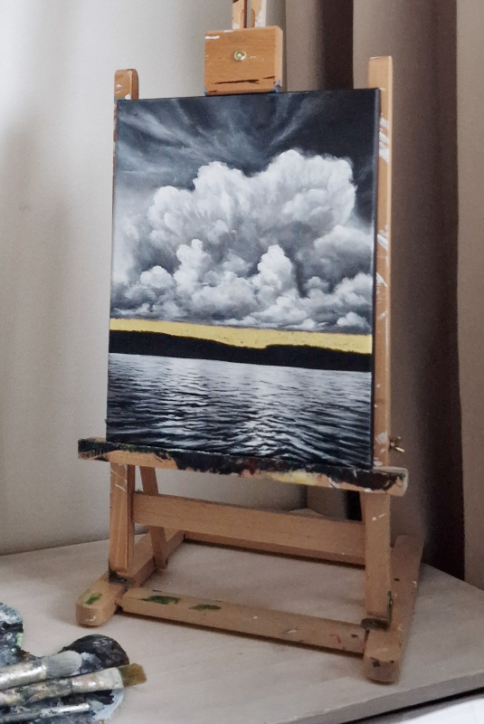 Kuvaus: Akryylimaaleilla canvakselle maalattu teos, yksityiskohtana 22 karaatin lehtikultaa